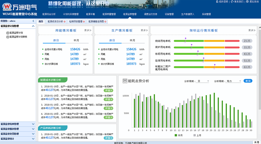 2、根据生产系统提供的生产计划信息,以及生产原料、能源介质购入和库存信息,结合从实时监测系统中采集处理的各能源介质的实绩信息,计算能源单耗和能源平衡,帮助企业制定合理的生产及能源指标计划,对公司能源使用效率给出科学的分析和指导。